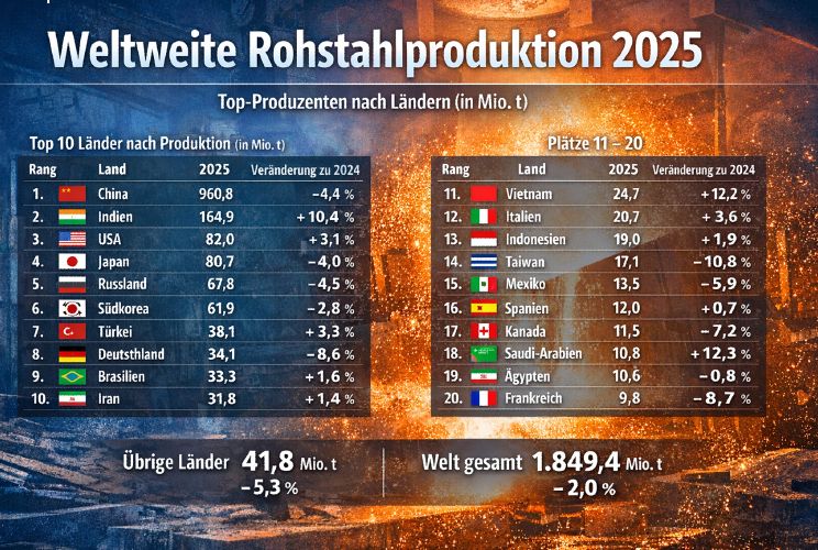 Mehr Informationen Weltweite Rohstahlproduktion sinkt im Dezember 2025 um 3,7 Prozent