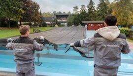 Duisburg - Azubis von ThyssenKrupp Steel Europe halfen, das Schwimmbecken am Barbarasee für die kalte Jahreszeit vorzubereiten.