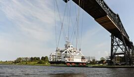 Kamen - Die Schwebefähre befördert Fußgänger, Rad- und Autofahrer über den Nord-Ostsee-Kanal. Auch wenn sie ein Wunderwerk der Technik ist, schwebt die Fähre natürlich nicht.