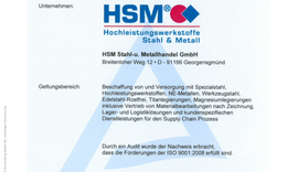 Georgensgmünd - HSM Hochleistungswerkstoffe, Stahl und Metall hat ein neues Qualitätszertifikat sowie die Bisnode-Auszeichnung erhalten.