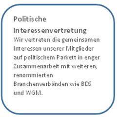 Wir vertreten die gemeinsamen Interessen unserer Mitglieder auf politischem Parkett in enger Zusammenarbeit mit weiteren, renommierten Branchenverbänden wie BDS und WGM.