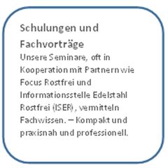 Unsere Seminare, oft in Kooperation mit Partnern wie Focus Rostfrei und Informationsstelle Edelstahl Rostfrei (ISER), vermitteln Fachwissen. – Kompakt und praxisnah und professionell.