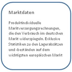 Produktindividuelle Marktversorgungsrechnungen, die den Verbrauch im deutschen Markt widerspiegeln. Exklusive Statistiken zu den Lagerabsätzen und -beständen auf dem wichtigsten europäischen Markt.