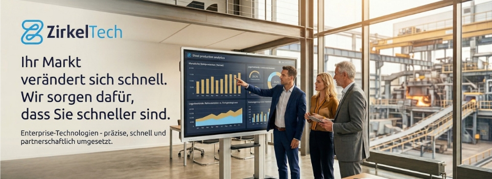 ZirkelTech versteht sich als Technologiepartner, der Branchenprozesse in den Mittelpunkt stellt und nicht Technologie um ihrer selbst willen. Das Leistungsportfolio gliedert sich in zwei Säulen: Enterprise-Lösungen mit SAP S/4HANA, SAP Business One Production, Salesforce und Microsoft Dynamics 365 sowie Product Engineering mit Anwendungsentwicklung in C#/.NET, TypeScript/React und Python, ergänzt durch Data & AI, Cloud & DevOps sowie Legacy-Modernisierung.