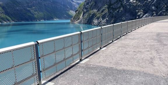 Bildtext: Seeseitige Absturzsicherung mit langlebigen Lochblechen an der Limmern Staumauer von SCHÄFER Lochbleche.