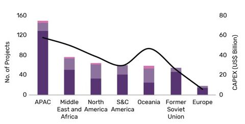Voraussichtlich werden sich die meisten Bergbau-Projekte – wahrscheinlich 38% der Gesamtzahl - im APAC-Raum befinden, gefolgt von den Regionen Naher Osten und Afrika (15%), der ehemaligen Sowjetunion (14%) und Nordamerika (10%). Die Ausgaben bezogen auf den Investitionswert liegen im Verhältnis niedriger, in APAC bei 23% des Gesamtvolumens, gefolgt vom Nahen Osten und Afrika (20%), Ozeanien (18%) und Nordamerika (15%).
