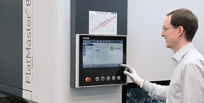 Quelle: ARKU Maschinenbau GmbH; Vorschau-Bild: Über die FlatMaster-Steuerung werden die Ebenheitswerte im Zehntelmillimeterbereich erfasst und können wieder abgerufen werden. Bild oben rechts: Der neue FlatJack von ARKU kontrolliert die Ebenheit von Stanz-, Laser- und Brennteilen schnell, genau und mit geringem Aufwand. (Fotos: ARKU). FlatJack und FlatMaster sind eingetragene Warenzeichen der ARKU Maschinenbau GmbH.