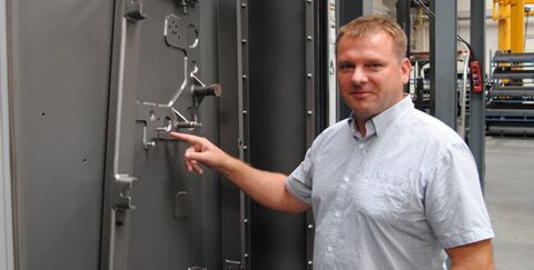 Bildtext (Vorschaufoto): Josef Burian, Leiter der Lackiererei von ZOELLER SYSTEMS, vor der AGTOS Hängebahn-Strahlanlage HT 10-20-3.6-08-07,5 mit einem gestrahlten Werkstück.