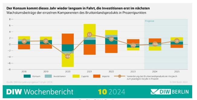 Als Wachstumsbremse wirkt sich zunächst die aktuelle Investitionsschwäche aus. Im Jahr 2024 sinken die Ausrüstungsinvestitionen zunächst, auch die Bauinvestitionen schwächeln weiter. Nach und nach dürfte aber die globale Industrieproduktion wieder anziehen und die derzeit schwache Auslandsnachfrage beleben, so dass die Exporte wohl stetig zunehmen. Als wichtigsten konjunkturellen Beitrag der Finanzpolitik sehen die DIW-Konjunkturforschenden das Sondervermögen Bundeswehr. Rüstungsausgaben dürften ab der zweiten Jahreshälfte und vor allem im kommenden Jahr wichtige expansive Impulse liefern. Darüber hinaus trägt die Finanzpolitik jedoch kaum zur konjunkturellen Entwicklung bei.