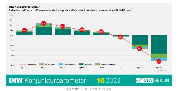 Das Konjunkturbarometer des Deutschen Instituts für Wirtschaftsforschung (DIW Berlin) ist im Oktober noch einmal deutlich gesunken. Es liegt nun bei 74,3 Punkten, gut fünf Punkte niedriger als im Vormonat, und damit nun noch einmal weiter weg von der 100-Punkte-Marke, die ein durchschnittliches Quartalswachstum von 0,3 Prozent anzeigen würde. „Deutschland ist in eine Rezession geschlittert. Sofern keine Gasmangellage eintritt, dürfte die Wirtschaft aber deutlich weniger schrumpfen als während der Finanzkrise oder im ersten Jahr der Corona-Pandemie“, sagt DIW-Konjunkturexperte Guido Baldi. „Die Risiken für den weiteren Verlauf bleiben aber erheblich.“