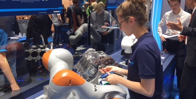Die Frage über die Messe hinweg: Wie werden Menschen in Zukunft arbeiten? Mit der Sonderschau „Der Mensch in der Smart Factory“ machte der Fachverband VDMA Robotik + Automation die Arbeitswelt 4.0 greifbar: Digitale Assistenzsysteme als Unterstützer in der Handmontage, Augmented Reality, Gestensteuerung, Exoskelette und Wearables, die die Interaktion zwischen Mensch und Maschine vereinfachen. Patrick Schwarzkopf, Geschäftsführer des Fachverbandes VDMA Robotik + Automation, erklärt: „Arbeitsplätze werden attraktiver und ergonomischer. Die jeweiligen Stärken von Mensch und Maschine sind komplementär! Das eröffnet eine große Chance für eine bessere Arbeitsplatzgestaltung. Dieses Thema prägt die automatica wie kaum eine andere Messe.“