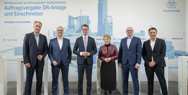 Foto: Burkhard Dahmen, CEO SMS group, Bernhard Osburg, CEO thyssenkrupp Steel; Hendrik Wüst, Ministerpräsident Nordrhein-Westfalen, Martina Merz, CEO thyssenkrupp, Sören Link, Oberbürgermeister Duisburg, Tekin Nasikkol, Gesamtbetriebsratsvorsitzender thyssenkrupp Steel