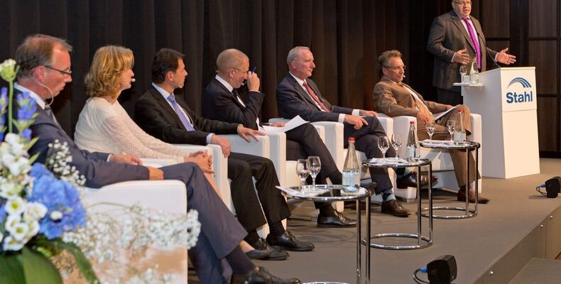 Quelle: Wirtschaftsvereinigung Stahl Bildtext: v.l.n.r. Dr. Matthias Heider MdB (CDU), Kerstin Andreae MdB (BÜNDNIS 90/DIE GRÜNEN), Frank Schulz (ArcelorMittal Germany Holding), Moderator Klaus Stratmann, Bernd Westphal MdB (SPD) und Klaus Ernst MdB (DIE LINKE), Peter Altmaier (Chef des Bundeskanzleramtes und Minister für besondere Aufgaben. (Foto: Wirtschaftsvereinigung Stahl / Dirk Heckmann)