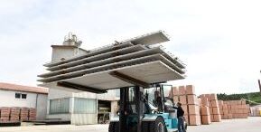 Elementdecke, Balkone, Treppen und Sonderteile stellt die Wöhrl Ziegelwerk-Deckensysteme GmbH für eine große Bandbreite von Anwendungen in Berghaselbach bei Freising her. Das Familienunternehmen mit 170 Jahren Erfahrung bietet ein Portfolio von 100 unterschiedlichen Produkten – neben Betonteilen auch Ziegel. Eine in Bayern einzigartige Angebotskombination. Die Fertigteile sind 3 bis 16 Tonnen schwer und können bis zu 9 Meter lang sein. „Damit unsere Produkte unbeschadet am Bau ankommen, müssen sie schonend transportiert werden“, erläutert Thomas Wöhrl, Geschäftsführer und Inhaber der Wöhrl Ziegelwerk-Deckensysteme GmbH. „Deshalb legen wir sie auf Doppel-T-Träger.“ Diese werden dann vom Schwerlaststapler angehoben und an ihren Lagerplatz gebracht. Dabei muss der Stapler einerseits sehr robust sein, weil sich Betonstaub aus dem Werk und Außenlager an- und in der Hydraulik absetzt. Gleichzeitig ist Feinfühligkeit und Flexibilität gefragt: Um optimal in die Träger zu passen, müssen die Zinken des Schwerlaststaplers speziell geformt sein. Thomas Wöhrl: „Zudem muss sich die Gabel erweitern lassen, damit der Stapler auch große Teile sicher aufnehmen kann.“