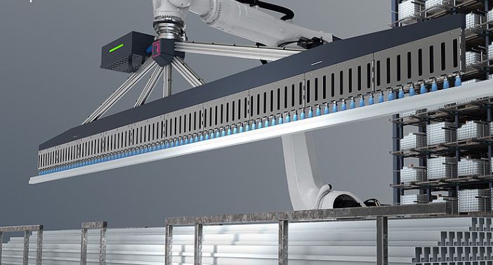Ein zentrales Element ist die KI-gestützte Bilderkennung. Sie erfasst zuverlässig die Lage von verpackten und unverpackten Langgütern in Ladungsträgern sowie die ideale Ablageposition. Für die Entnahme stehen Vakuum-, Magnet- oder mechanische Greifwerkzeuge zur Auswahl. Auch ein automatischer Werkzeugwechsel ist möglich.