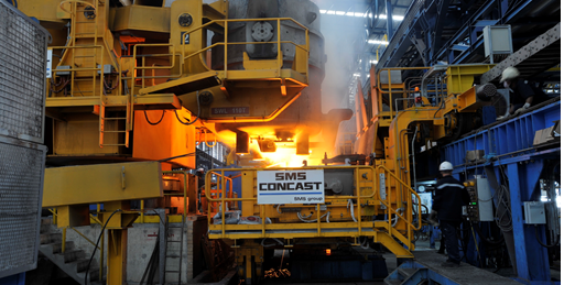 Quelle: SMS group Bildtext: Abgießen von Stahl auf der neuen Knüppel-Stranggießanlage (Foto: SMS group)