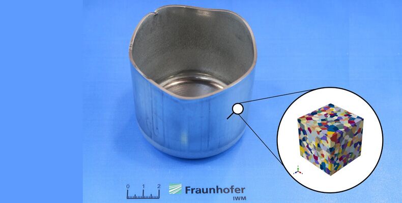 Bildbeschreibung: Die Zipfelbildung im Randbereich des tiefgezogenen Napfes wird durch die richtungsabhängigen Eigenschaften im Blechwerkstoff hervorgerufen. Mit dem Virtuellen Labor wird ein Mikrostrukturmodell des Blechwerkstoffes aufgebaut und die Richtungsabhängigkeit vorhergesagt. Die Kantenlänge des Mikrostrukturmodells beträgt ca. 150 μm.
