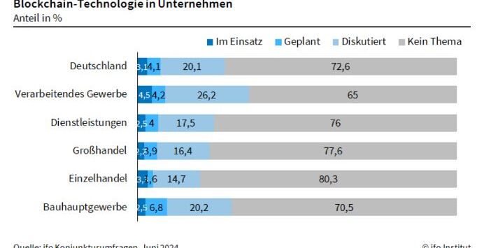 Im Verarbeitenden Gewerbe setzen 4,6% der Großunternehmen Blockchain ein und 6% planen es. Jedes Vierte diskutiert darüber. Im Bau arbeiten 5% der Großunternehmen mit dieser Technologie, 19% planen, sie einzusetzen und jedes Dritte diskutiert über ihren Einsatz. 5,4% der großen Dienstleister verwenden Blockchain in ihren Unternehmensprozessen und jeder Vierte plant, sie einzusetzen oder beschäftigt sich mit diesem Thema. Kaum Anwendungsmöglichkeiten für die Blockchain-Technologie sieht der Großhandel für sich. Im Einzelhandel setzen dagegen 8,6% Blockchain bereits ein.