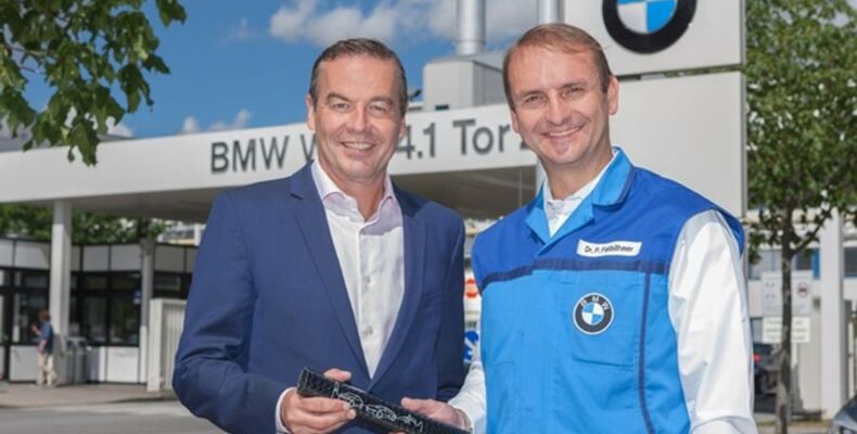 Quelle: BMW Group Bildtext: Ralf Hattler (links) übergab den Staffelstab aus Carbon symbolisch an seinen Nachfolger im Amt des Standortleiters, Dr. Peter Fallböhmer (rechts). (Foto: BMW)