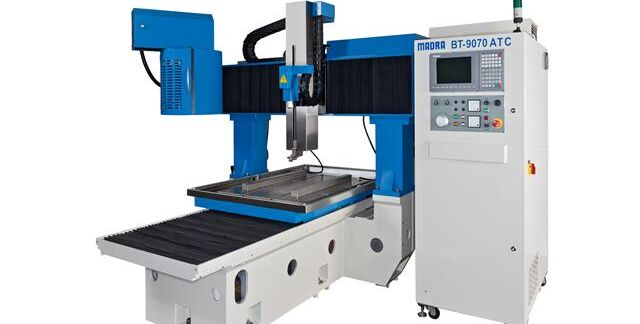Die CNC-Streckensteuerung ist zur Ansteuerung von insgesamt 8 Achsen ausgelegt. Hierdurch kann ein separater Teilapparat, Rundtisch oder Rund-Schwenktisch zur Lösung von Bearbeitungsaufgaben eingesetzt werden. Optional ist auch ein schwenkbarer Arbeitskopf lieferbar. Das Einsatzgebiet für den funkenerosiven „Bohrteufel“ MADRA BT-9070 ATC ist das Einbringen von Bohrungen in Werkstücke aus elektrisch leitenden Materialien (Stahl, Hartmetall) im allgemeinen Werkzeugbau, sowie für spezielle Bearbeitungsaufgaben an Turbinenschaufeln, Felgen, Rundlagern usw.