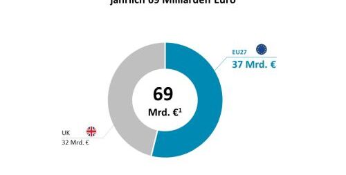 Die direkten Kosten des Brexit werden sich für Unternehmen in der EU27 auf 37 Milliarden Euro und für Unternehmen im Vereinigten Königreich (UK) auf 32 Milliarden Euro belaufe. Dies sind die Ergebnisse der Studie "The 'Red-Tape' Cost of Brexit" der Strategieberatung Oliver Wyman und der Anwaltssozietät Clifford Chance. Demnach entfallen in der EU allein neun Milliarden Euro auf deutsche Unternehmen, 80 Prozent davon auf die Branchen Automobil, Chemie, sonstige Fertigung, Lebensmittel/Getränke und Konsumgüter. 70 Prozent der in Deutschland anfallenden Kosten entstehen in nur vier der 16 Bundesländer - Bayern, Nordrhein-Westfalen, Baden-Württemberg und Niedersachsen.
