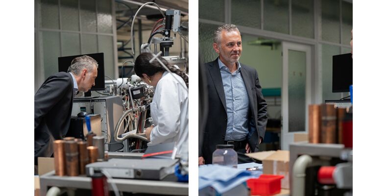 Beim Besuch zeigten Wissenschaftlerinnen und Wissenschaftler des MPI SusMats wie sie mit Wasserstoff-Plasma Eisen klimaneutral aus Erzen oder sogar aus Industrieabfällen gewinnen, wie sie Magnete aus Windkraftanlagen und Elektroautos recyceln und wie sie erforschen, Katalysatoren zur Wasserspaltung effizienter und langlebiger zu machen. Ein weiteres Thema war auch die Nutzung von künstlicher Intelligenz und maschinellem Lernen mit deren Hilfe die ForscherInnen Experimente gezielter entwickeln.