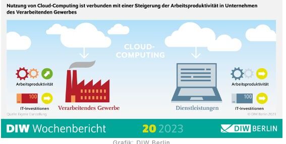 Immer mehr Unternehmen in Deutschland verlegen ihre IT-Aktivitäten in die Cloud, statt auf eigene Lösungen zu setzen. Sie versprechen sich davon in der Regel Einsparungen und Effizienzgewinne. Eine aktuelle DIW-Studie kommt zu dem Schluss, dass Cloud-Lösungen zwar die IT-Investitionen nicht senken, aber – zumindest bei Industrieunternehmen – die Produktivität steigern. Ökonomen des Deutschen Instituts für Wirtschaftsforschung (DIW Berlin) haben für die Studie aktuelle aggregierte Daten von Eurostat und deutsche Unternehmensdaten ausgewertet. Der Anteil der europäischen Unternehmen, die Cloud-Lösungen nutzen, ist demnach von 2014 bis 2021 von 18 auf 41 Prozent gestiegen. Deutschland hinkte dieser Entwicklung lange hinterher: Nutzten 2014 elf Prozent der deutschen Unternehmen Cloud-Lösungen, waren es 32 Prozent im Jahr 2020. Im folgenden Jahr gelang es Deutschland aber, um zehn Prozentpunkte zuzulegen und damit den europäischen Durchschnitt zu toppen.
