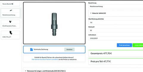 Für die Preiskalkulation lädt der Benutzer ein CAD-Modell (STEP-Datei) des zu fertigenden Bauteils im Online-Shop hoch und wählt das gewünschte Material, die Stückzahl (1 - 1000) und den Liefertermin. Zusätzlich hat der Kunde die Möglichkeit, eine technische Zeichnung im PDF-Format hochzuladen, aus der Informationen zu individuellen Fertigungstoleranzen, Passungen, Gewinden und Oberflächen automatisiert ausgelesen werden. Dadurch können funktionale Bauteile mit hohen technischen Anforderungen berücksichtigt werden. Mit Hilfe eines Algorithmus berechnet die Plattform in wenigen Sekunden einen Angebotspreis, zu dem die Kunden die Bauteile direkt bestellen können.