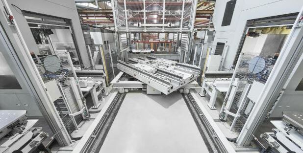 Unternehmen können mehrere geeignete Bearbeitungsmaschinen – unabhängig vom Hersteller – an ein Turmlager anbinden. Über Verschiebeeinheiten und Rollenbahnen lässt sich der UNITOWER cnc vollautomatisch mit mehreren Rüst- und Maschinenübergabeplätzen verbinden. Das Regalbediengerät (RBG) übergibt die mit Vorrichtung und Werkstücken gerüstete Maschinenpalette an einen Verschiebewagen. Dieser bringt sie selbstständig an den von der Steuerung vorgegebenen Platz. Auf dem gleichen Weg können auch teil- sowie fertig bearbeitete Paletten mit Vorrichtungen und Werkstücken zwischen- oder rückgelagert werden.