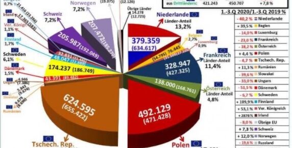 Wichtigste Abnehmerländer waren die Niederlande mit 150.500 Tonnen, gefolgt von Italien mit 144.450 Tonnen und Luxemburg mit 83.000 Tonnen. In den ersten drei Quartalen 2020 waren die Exporte insgesamt um 9,2 Prozent niedriger als im Vorjahr.