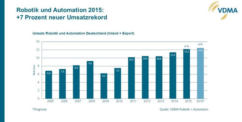 Die Robotik und Automation in Deutschland hat 2015 laut dem VDMA das Rekord-Umsatzvolumen von 12,2 Milliarden Euro erreicht - ein Plus von 7 Prozent im Vergleich zum Vorjahr. Aufgeschlüsselt nach den drei Segmenten bilden die Integrated Assembly Solutions (vormals Montage- und Handhabungstechnik) mit einem Umsatzvolumen von 6,9 Milliarden Euro die größte Teilbranche (plus 10 Prozent). Die Robotik erwirtschaftete ein neues Rekordergebnis von 3,3 Milliarden Euro (plus 1 Prozent) und die Industrielle Bildverarbeitung von 2 Milliarden Euro (plus 9 Prozent).