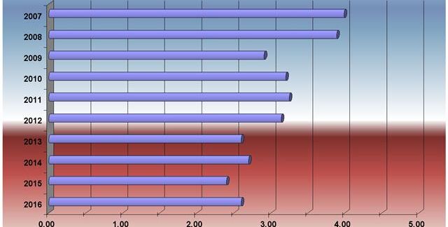 Europaweit war das positive Ergebnis auf Produktionssteigerungen bei geschweißten Stahlrohren bis 16“ Außendurchmesser und Großrohren zurückzuführen, wohingegen die Produktion nahtloser Stahlrohre vor allem wegen der anhaltenden Investitionszurückhaltung der Energieindustrie rückläufig war. Das an sich erfreuliche Ergebnis für die deutsche Stahlrohrindustrie relativiert sich allerdings, wenn man weiß, dass vor der Wirtschafts- und Finanzkrise 2008/2009 hierzulande schon einmal fast vier Mio. Tonnen Stahlrohre hergestellt wurden. Nach dem Einbruch in 2009 mit deutlich unter drei Millionen Tonnen gab es in den Jahren 2010 bis 2012 eine Erholungsphase, in der wieder weit mehr Stahlrohre produziert wurden. Nach einem erneuten Einbruch im Jahr 2013 pendelte sich die Produktion in Deutschland dann auf einen Wert um die 2,5 Millionen Tonnen ein (Bild: Deutscher Stahlrohrmarkt 2007-2016). Neben der allgemeinen wirtschaftlichen Entwicklung ist vor allem die Dominanz des Öl- und Gassektors auf Abnehmerseite für die starken Schwankungen der Produktionszahlen verantwortlich.
