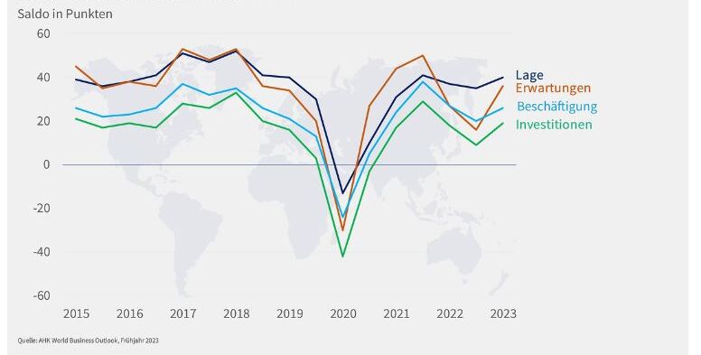 Nach dem Ende der Null-Covid-Politik rechnen etwa in China 40 Prozent der dort aktiven deutschen Unternehmen mit einem kräftigen Aufschwung in den kommenden zwölf Monaten, 19 Prozent dagegen mit einer schwächeren Konjunkturentwicklung. Ihre aktuelle Geschäftslage bewerten dort 29 Prozent der Betriebe als gut und 22 Prozent als schlecht. Das ist unter dem Strich sogar eine pessimistischere Lagebeurteilung als noch im Herbst, zum Zeitpunkt der Vorumfrage (32 Prozent gut, 18 Prozent schlecht). Die Unsicherheit über die wirtschaftliche Entwicklung nach dem Ende der Null-Covid-Politik beeinflusst die aktuelle Stimmung der Unternehmen noch negativ.