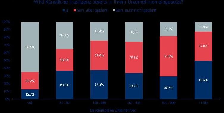 Weitere Ergebnisse der ifaa-Analyse zeigen, dass größere Unternehmen verstärkt KI einsetzen oder den Einsatz planen. Davon geben 50% der Studienteilnehmenden aus Unternehmen mit mehr als 1000 Beschäftigten an, dass in ihrem Unternehmen bereits KI eingesetzt wird. Weitere 38% bestätigen die Planung des KI-Einsatzes. Im Vergleich hierzu geben 65% der beteiligten Kleinstunternehmen mit weniger als 50 Beschäftigten an, dass KI weder eingesetzt noch ihr Einsatz geplant ist.