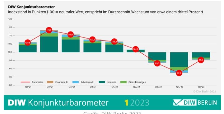 Im Dezember hatte das Barometer einen Wert von nur knapp 83 Punkten erreicht. Eine noch im Herbst befürchtete deutliche Winterrezession wird – obwohl die deutsche Wirtschaft Ende des Jahres 2022 leicht geschrumpft ist – immer unwahrscheinlicher, auch weil in diesem bislang milden Winter wohl nicht mehr mit einer Gasmangellage gerechnet werden muss. „Die deutsche Wirtschaft zeigt sich erfreulich widerstandsfähig“, sagt DIW-Konjunkturexperte Guido Baldi. „Die Chancen stehen gut, dass wir mit nicht mehr als einer schwachen Rezession davonkommen. Nichtsdestotrotz bleiben die Risiken für die Konjunktur hoch.“