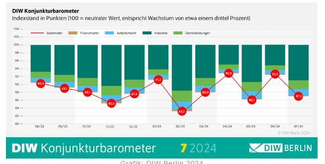 Damit entfernt sich der Barometerwert wieder von der neutralen 100-Punkte-Marke, die ein durchschnittliches Wachstum der deutschen Wirtschaft anzeigt. „Nach dem leichten Rückgang der Wirtschaftsleistung im vergangenen Vierteljahr kommt die Konjunktur wohl auch im laufenden dritten Quartal noch nicht richtig in Schwung – obwohl die Inflationsraten rückläufig sind und vielerorts Tariflohnsteigerungen vereinbart wurden“, sagt Geraldine Dany-Knedlik, Leiterin des Bereichs Prognose und Konjunkturpolitik im DIW Berlin. „Dass viele Verbraucher*innen mittlerweile real wieder mehr Geld zur Verfügung haben, dürfte den privaten Konsum fortan aber beleben und in der zweiten Jahreshälfte eine etwas stärkere konjunkturelle Dynamik in Gang bringen“, so Dany-Knedlik.