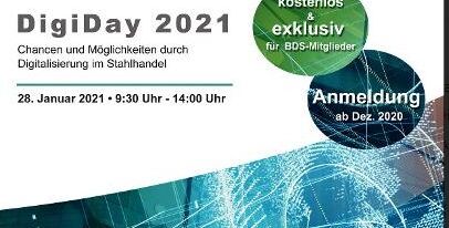 Zum zweiten Mal veranstaltet der Bundesverband Deutscher Stahlhandel am 28. Januar seinen DigiDay unter dem Motto „Chancen und Möglichkeiten durch Digitalisierung im Stahlhandel“. Erstmals wird die Veranstaltung ausschließlich online stattfinden. Die eingeladenen Referenten werden zwischen 9.30 und 14.00 Uhr live sprechen und anschließend Fragen aus dem digitalen Plenum beantworten. Der DigiDay 2021 ist exklusiv und kostenlos für Mitglieder des BDS; um eine Anmeldung bis Dezember wird gebeten.
