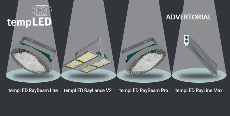 Es gibt Neuigkeiten aus der Produktfamilie der tempLED GmbH: Vier verschiedene Hallenleuchten erstrahlen demnächst in neuem Design und mit erhöhter Systemeffizienz. Die Anwendungen reichen von Montage- bis über Lager- und Sporthallen.