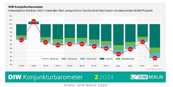 Damit liegt der Barometerwert wieder sehr deutlich unter der neutralen 100-Punkte-Marke, die ein durchschnittliches Wachstum der deutschen Wirtschaft anzeigt. Nachdem das Bruttoinlandsprodukt im vierten Quartal 2023 um 0,3 Prozent geschrumpft ist, schwinden die Hoffnungen auf ein kleines Plus im Auftaktquartal 2024. Das DIW-Konjunkturbarometer deutet nun darauf hin, dass die Wirtschaftsleistung auch im laufenden Vierteljahr leicht schrumpfen wird. „Die deutsche Wirtschaft tut sich schwer damit, einen Weg aus dem Konjunkturtief zu finden“, sagt Timm Bönke, Co-Leiter des Bereichs Prognose und Konjunkturpolitik im DIW Berlin. „Sie kämpft weiterhin mit den Folgen des russischen Überfalls auf die Ukraine, den höheren Zinsen, unklaren wirtschaftspolitischen Rahmenbedingungen sowie der nur moderat zulegenden Weltwirtschaft. Auch das Erstarken populistischer und extremer Parteien trägt nicht dazu bei, dass die Unternehmen hierzulande zuversichtlicher in die Zukunft blicken können“, so Bönke.
