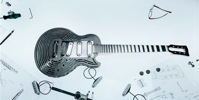 - Der Gitarrenkorpus wurde additiv gefertigt bzw. 3D-gedruckt – dabei wird Titanpulver von einem Laser zu mikroskopisch dünnen Schichten verschmolzen.