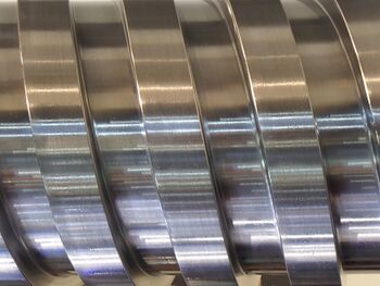 Bei dem 1,2 Tonnen schweren Exponat handelt es sich um eine Spindel, die in sogenannten Reibradspindelpressen eingesetzt wird. Die Besonderheit ist das zweigängige Gewinde mit 8“ Steigung. Das Bauteil ist ein Produkt der Konzerntochter Deutsche Edelstahlwerke GmbH.