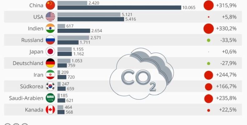 Gemessen an der Veränderung der Emissionen von 1990 bis 2018 hat Indien am stärksten zugelegt. In dieser Zeitspanne stieg der CO₂-Ausstoß des Landes um rund 330 Prozent - maßgeblich verursacht durch das gigantische Wirtschaftswachstum. Indien ist stark mit dem Kampf gegen die hohe Armut in weiten Teilen der Bevölkerung beschäftigt, Klimaschutz hat dort nicht oberste Priorität. In den USA hat unter anderem der Transportsektor zuletzt mehr CO₂ ausgetoßen, insbesondere die Emissionen durch Flugzeuge und Lkws legten zu.