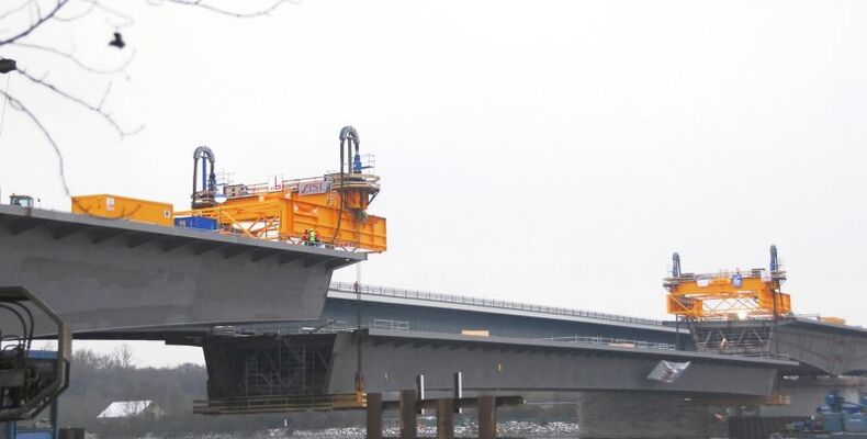 Quelle: Dillinger Hütte Bildtext: Gelungener Einhub: Neubau der Schiersteiner Rheinbrücke schreitet voran (Foto: Dillinger Hütte)