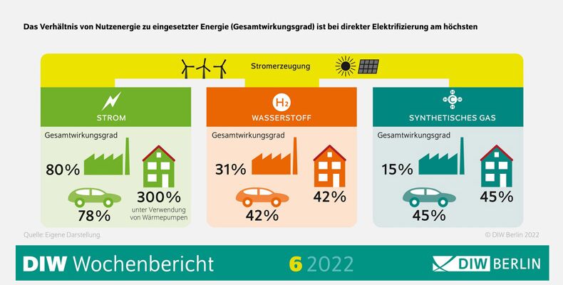 „Um Klimaneutralität zu erreichen, muss die Stromerzeugung aus erneuerbaren Energien massiv ausgebaut werden“, sagt Studienautorin Franziska Holz. „Noch wird diskutiert, welche Energieträger sich zukünftig durchsetzen werden. Unsere Studie zeigt, dass die direkte Nutzung von Strom aus Erneuerbaren für Endverbraucher wie Unternehmen und Haushalte kostengünstiger und effizienter ist als eine indirekte Elektrifizierung, etwa über synthetische Gase oder Wasserstoff.“
