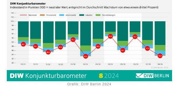 Das Konjunkturbarometer des Deutschen Instituts für Wirtschaftsforschung (DIW Berlin) ist im August erneut zurückgegangen. Es liegt nun bei 83,4 Punkten – fast vier weniger als im Juli – und entfernt sich somit weiter von der neutralen 100-Punkte-Marke, die für ein durchschnittliches Wachstum der deutschen Wirtschaft steht. Damit bleiben die Aussichten für die deutsche Konjunktur im laufenden dritten Quartal merklich gedämpft. Die Wirtschaftsleistung dürfte kaum zulegen – wenn überhaupt. „Die holprige weltwirtschaftliche Entwicklung, insbesondere in China und dem Euroraum, bremst weiterhin die deutsche Exportwirtschaft, was die Unternehmen wiederum mit Investitionen zögern lässt“, erklärt Geraldine Dany-Knedlik, Leiterin des Bereich Prognose und Konjunkturpolitik im DIW Berlin. „Zudem ist trotz der eingeleiteten Zinswende das Zinsniveau weiterhin hoch. Lediglich der private Konsum wird dank stabiler Inflationsraten und weiterhin steigender Einkommen in diesem Quartal wohl etwas zur Stabilisierung der Wirtschaftsleistung beitragen“, so Dany-Knedlik.