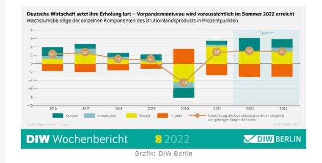 Die Corona-Pandemie drückt der deutschen Wirtschaft auch in diesem Jahr ihren Stempel auf. Derzeit sorgt die Omikron-Infektionswelle für einen trüben Winter: Zwar sind die Einschränkungen des wirtschaftlichen und gesellschaftlichen Lebens vor allem dank der Impffortschritte nicht so weitreichend wie vor einem Jahr, doch nie zuvor im Laufe der Pandemie waren so viele Menschen und damit auch Arbeitskräfte gleichzeitig erkrankt wie zuletzt. Auch aufgrund unterbrochener Lieferketten stockt die Produktion vielerorts. Gleichzeitig meiden viele Menschen kontaktintensive Dienstleistungen wie Restaurantbesuche oder Hotelübernachtungen. Aufgrund des mauen Jahresbeginns prognostizieren die KonjunkturforscherInnen des Deutschen Instituts für Wirtschaftsforschung (DIW Berlin) ein Wachstum der deutschen Wirtschaft im laufenden Jahr von 3,0 Prozent. Für das nächste Jahr erwarten sie ein Plus von 2,9 Prozent.