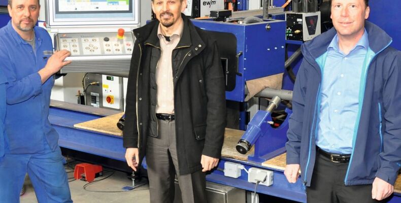 Quelle: Westfalen AG Bildtext: Inbetriebnahme der Ekonor-Rohrschweißanlagen in Lindlar (v. li.): Thomas Börsch (Schweißer, Schmidt + Clemens), Ulf Jenter (Leiter Schweißen & Schneiden) und Thomas Hof (Vertrieb Ekonor, beide Westfalen Gruppe). (Foto: Schmidt + Clemens)