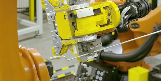 Damit die Fertigung sicher, schnell und sorgfältig umgesetzt werden kann, hat Transfluid zwei Roboter - die als Biegemaschinen im Einsatz sind - mit jeweils unterschiedlichen Magazinen ausgestattet. Ein Magazin ist ein sogenannter Kettenförderer. Er führt dem Biegeroboter lange Rohre zu. Anhand der vorher per Kodierung markierten Rohre erkennen die Roboter, welche Geometrien sie umsetzen müssen. Dabei sind sie in der Lage, ein langes Rohr jeweils von einer Seite zur Mitte hinzubiegen. Im Anschluss an die Bearbeitung wird das Werkstück auf einer Rutsche abgelegt.