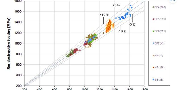 Bildtext: Vergleich der Ergebnisse der zerstörenden Prüfung mit dem von EMG IMPOC berechneten Rm für AHSS.