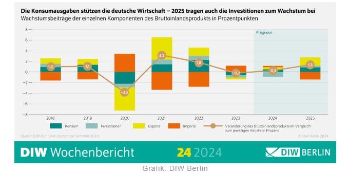 Die deutsche Wirtschaft berappelt sich – wenn auch nur langsam. Nach der aktuellen Prognose des Deutschen Instituts für Wirtschaftsforschung (DIW Berlin) wird die konjunkturelle Entwicklung in diesem Jahr stetig an Dynamik gewinnen, wobei sich der private Konsum zur treibenden Kraft für den Aufschwung entwickelt. Im kommenden Jahr geht es weiter bergauf. Wird das Wachstum für 2024 mit wohl 0,3 Prozent noch mager ausfallen – wenngleich besser als noch im Frühjahr erwartet –, dürfte sich der Aufholprozess in der Folge beschleunigen, sodass für 2025 ein solides Plus von 1,3 Prozent in Aussicht steht.